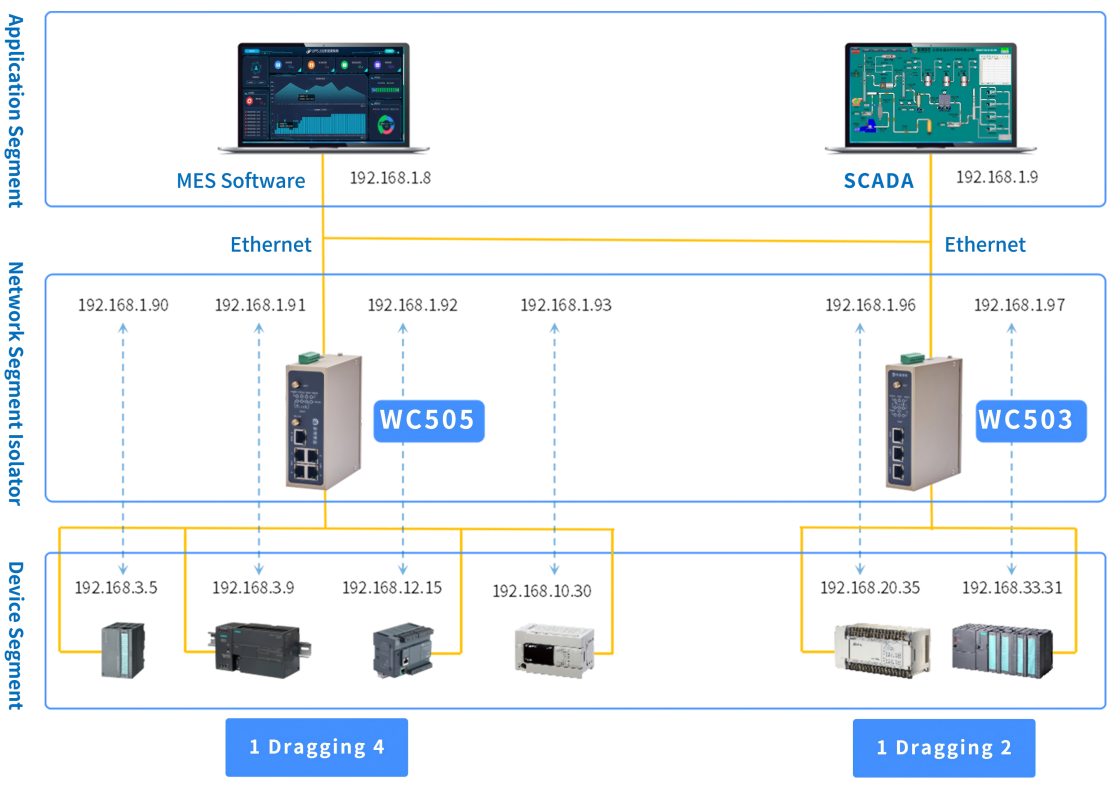 WC703 NAT Coupler (NAT Conversion Gateway) is suitable for network communication and data collection of PLC, HMI, CNC, DCS, MES, etc. in production networks. It integrates cross-segment isolation and IP conversion functions. Meanwhile, it supports network segment isolation and NAT conversion for more than 2 devices (e.g., PLC, CNC). For multiple devices in the workshop with IP addresses of different network segments, they can be unified into the same network segment to enable cross-segment access such as online programming, data collection, and remote management of devices (e.g., PLC, CNC).