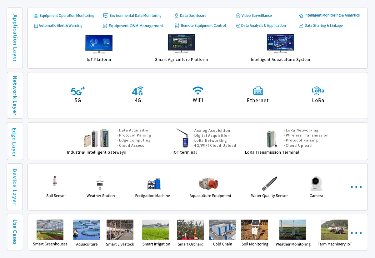 WideIOT has built a full-link smart agri-husbandry technical architecture of "Terminal Perception - Edge Transmission - Cloud Hub - Application Empowerment": Taking industrial intelligent gateways and industrial digital terminals as core edge access layer devices, it realizes standardized data collection and protocol parsing for various terminal equipment, including agricultural machinery operation equipment (such as seeders, harvesters, water-fertilizer integrated machines, etc.), breeding environmental control equipment (such as feeders, ventilation systems, etc.), and environmental monitoring sensors (such as temperature and humidity sensors, ammonia sensors, light sensors, etc.). Through stable edge computing and network transmission capabilities, it uploads equipment operation data and environmental parameter data to the IoT cloud platform in real time. At the cloud hub layer, it builds digital dashboards for full-scene agricultural and animal husbandry production based on the collected data, thereby realizing remote status management of terminal equipment, automatic fault alarms for abnormal working conditions, remote control of equipment start-stop, and precise remote optimization of operating parameters. Finally, it provides integrated smart solutions from equipment networking to intelligent operation for the agricultural and animal husbandry industry, helping traditional agriculture and animal husbandry transform towards digitalization and intelligence.