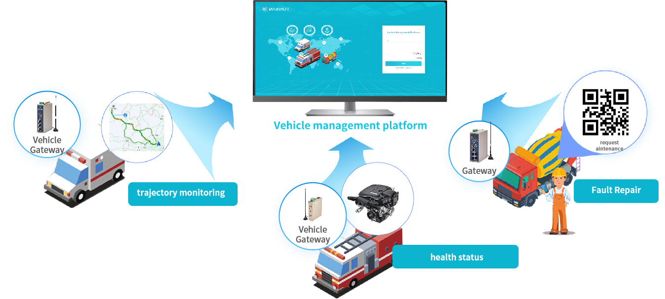 WideIOT leverages technologies such as big data, IoT, and mobile Internet to realize the collection and transmission of vehicle data and information. It collects and uploads key vehicle information and positioning data to the vehicle management platform in real time for display, monitoring, and analysis. This enables detection of the operating status of vehicle equipment, monitoring of vehicle driving trajectories, and issuance of alerts for abnormal situations—timely identifying vehicle anomalies. It assists operations managers in vehicle management and after-sales maintenance personnel in remotely handling faults, reducing the probability of accidents during vehicle operation. Additionally, it achieves full-lifecycle management of vehicles and integrated vehicle management, operation, and maintenance, helping enterprises improve vehicle operation efficiency, reduce operating costs, and enhance service quality and safety.