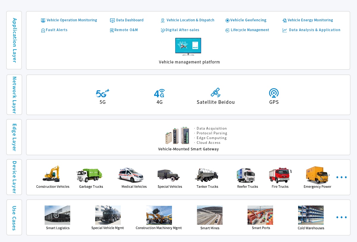 Targeting the digitalization needs of special vehicles, WideIOT takes vehicle-mounted intelligent gateways as the core to collect key data in real time, including vehicle driving parameters, powertrain status, and operating conditions of working equipment. Through edge-side local computing, data cleaning and format standardization are completed. Then, relying on 5G/4G wireless communication or Beidou network, the standardized data is uploaded to the special vehicle management platform. The platform enables real-time tracking of vehicle positions, remote monitoring of operating status, and timely early warning of abnormalities, providing technical support for efficient scheduling and safety management of special vehicles.