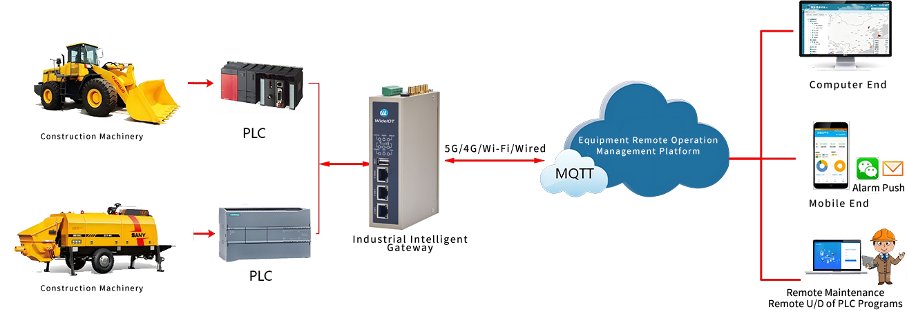 Through WideIOT's industrial smart gateway, controllers, sensors, and other devices in construction machinery are connected to collect real-time data including equipment location, operational status (such as active, idle, or malfunction), operating parameters (like engine RPM, oil pressure, coolant temperature), and fuel consumption. This collected data is transmitted to the equipment operation and maintenance management platform for analysis and processing. When equipment malfunctions occur, timely alerts are issued. Remote maintenance is performed via WideIOT's Equipment Maintenance Express, enhancing maintenance efficiency, reducing operational costs, and enabling comprehensive digital management throughout the equipment's entire lifecycle.