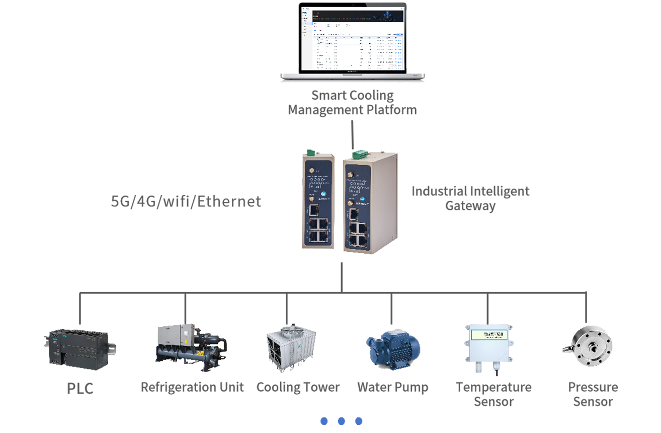 Using WideIOT's industrial smart gateway, real-time operational data is collected from refrigeration units, cooling towers, water pumps, and other equipment within the cooling supply system. This includes parameters such as temperature, pressure, flow rate, and power consumption. Simultaneously, data on indoor and outdoor ambient temperature, humidity, and cooling demand across different zones is gathered. The collected data is transmitted to the smart cooling management platform. Through data analysis and algorithmic models, the platform predicts cooling demand for various time periods and zones, optimizes equipment operating parameters, and enables intelligent control of the equipment. When equipment anomalies or potential failures occur, the system promptly issues alerts and provides diagnostic insights and troubleshooting recommendations. Furthermore, the platform features energy consumption cost accounting capabilities, delivering detailed energy usage reports and cost analyses to support cost control and energy-saving decision-making.