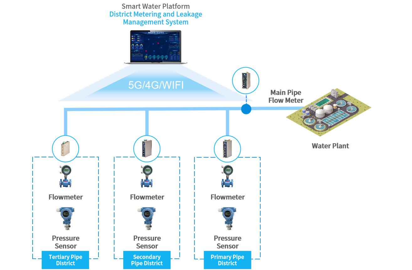 The water supply network is divided into multiple DMA zones. Flow sensors and pressure sensors are installed at the inlet and outlet of each zone. The collected flow and pressure data is transmitted in real time to the DMA zone metering and leakage monitoring platform via WideIOT's industrial smart gateway. The platform performs real-time data analysis and processing, utilizing mathematical models and algorithms to assess leakage conditions and precisely pinpoint leak locations. Additionally, the platform features zone-based metering management capabilities, enabling statistical analysis of water usage across each zone to support maintenance decision-making.