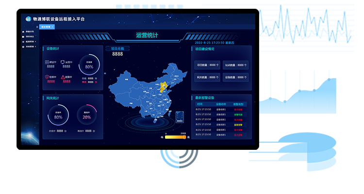 Through the operation of the large screen, the statistical analysis of online equipment and online gateways is realized, the distribution of equipment and project maps is calculated, and the abnormal alarms of gateways, equipment and channels are monitored.