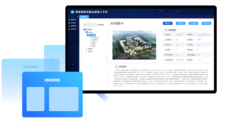 Realize the management of real-time monitoring projects, including project name, serial number, operation status, person in charge, number of sites, number of equipment, online statistics, and project introduction for management; maintain the online channel of the project, and view the log of the project channel.