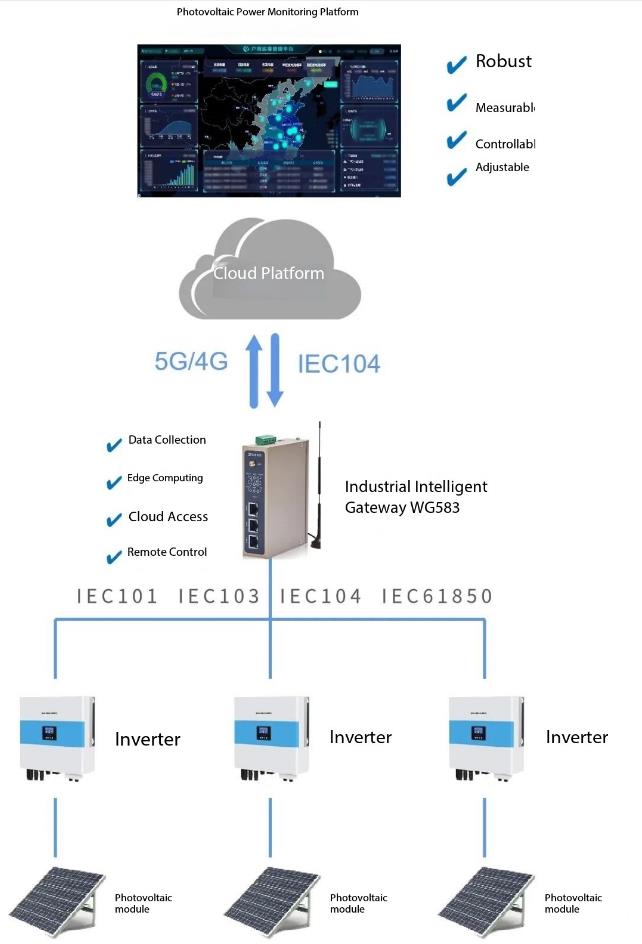 2. Gateway Layer: Industrial intelligent gateways have multiple serial ports and network ports, which can access various equipment of photovoltaic power plants. Through the protocol parsing engine, multi-source data is converted into the IEC104 standard format and connected to the State Grid management platform.