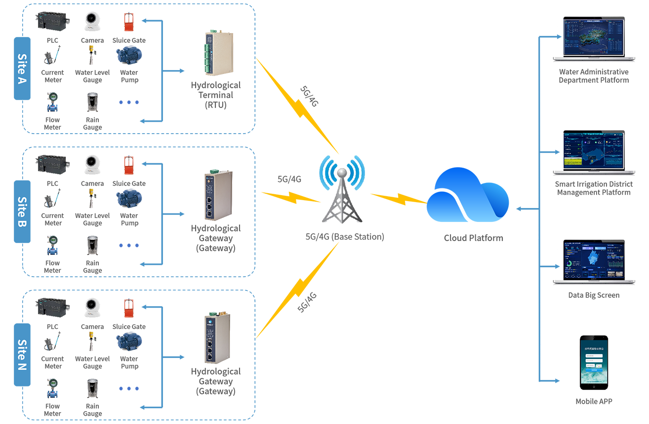 Integrated equipment within irrigation districts, including gates, water level gauges, and flow meters, connects to the WideIOT hydrological and water management gateway (RTU). Data is transmitted via 5G/4G to the water administration authority platform or other management platforms, enabling visual display and automatic alerts upon detecting abnormal readings. This facilitates precise management of channel water levels, flow rates, and rainfall-runoff conditions within irrigation districts. Furthermore, leveraging alert notifications and real-time data, managers can dynamically adjust irrigation water intake strategies, remotely control gate and pump operations, and remotely access surveillance footage. This significantly enhances operational efficiency and response capabilities, ensuring uninterrupted water supply for agricultural production.