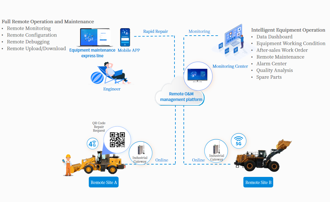 With "industrial intelligent gateways and equipment O&M management platforms" as the core, WideIOT builds a remote monitoring and intelligent O&M system for loaders, providing reliable support for equipment manufacturers to achieve digital transformation of O&M.