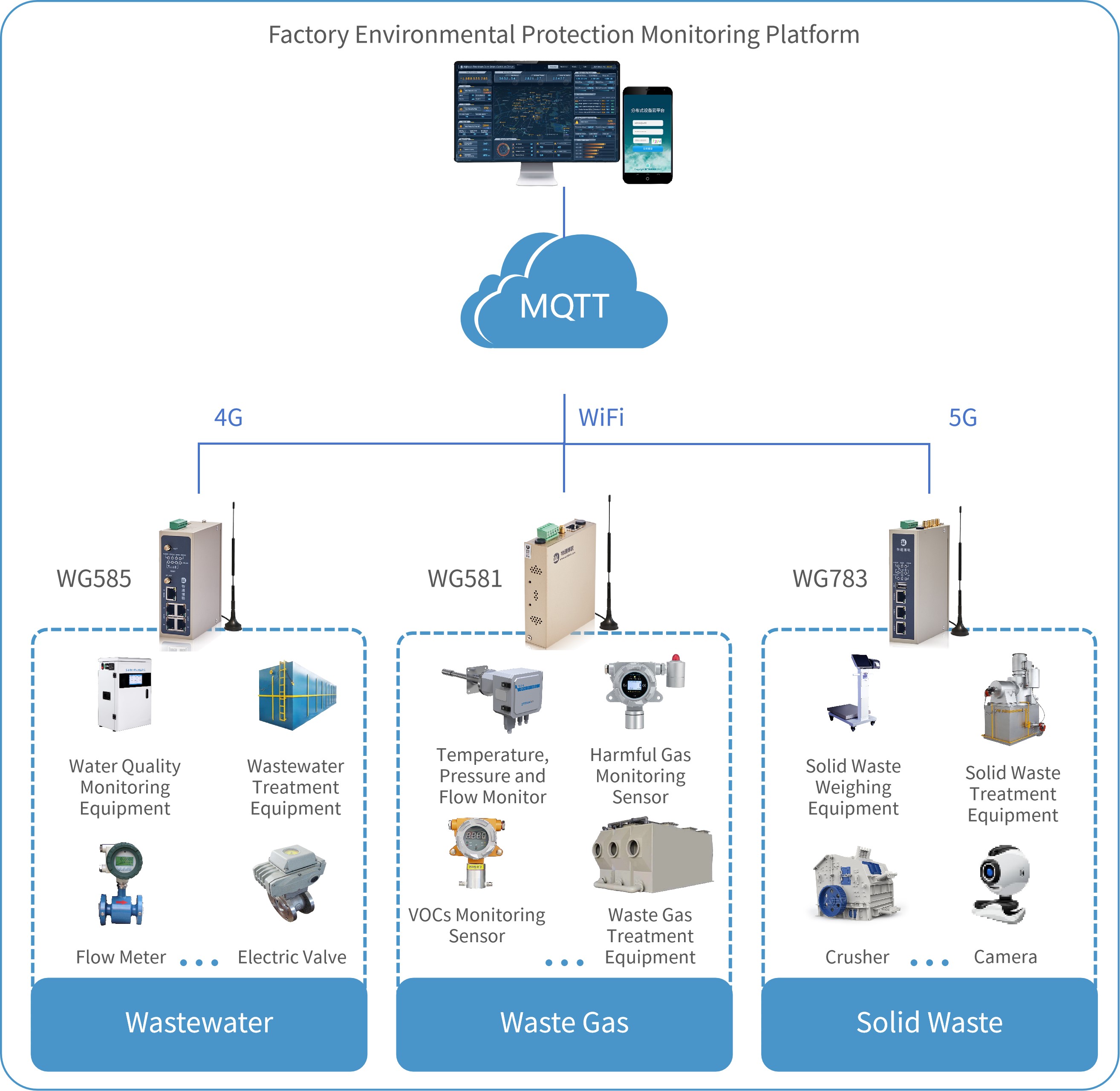 WideIOT offers an intelligent pollution monitoring and management system centered on "environmental data acquisition gateways + cloud-based monitoring platforms." By connecting various environmental monitoring devices—such as waste gas sensors, water quality monitors, and weighing instruments—to WideIOT’s industrial-grade environmental data acquisition gateways, the system realizes real-time data collection of:- Waste gas emissions (e.g., VOCs, particulate matter, sulfur dioxide)