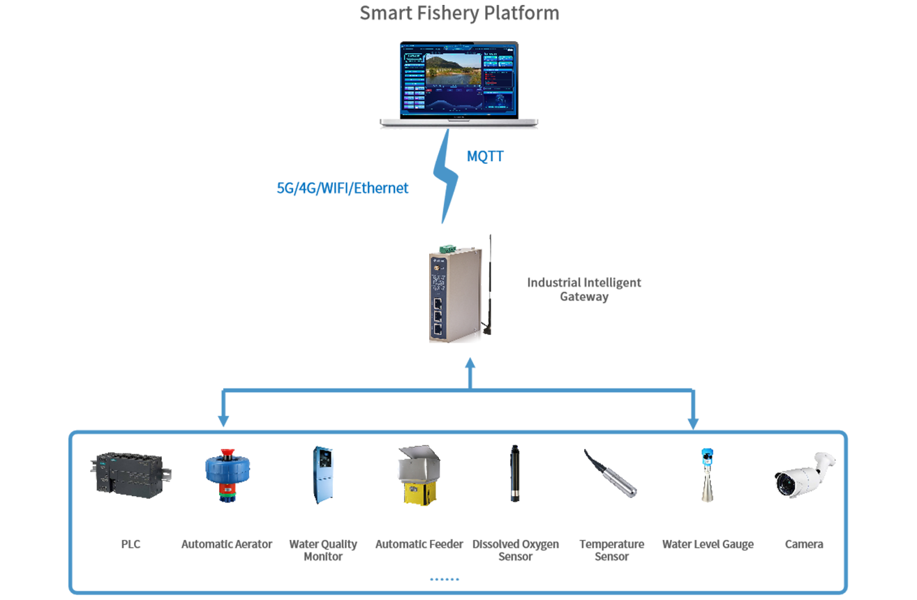 Install various water quality monitoring sensors in aquaculture ponds or tanks, such as dissolved oxygen sensors, pH sensors, and ammonia nitrogen sensors. Utilize WideIOT's industrial smart gateway to transmit collected water quality data in real time to the aquaculture water quality monitoring platform. The platform performs real-time analysis and processing of the data, promptly issuing alerts when dissolved oxygen levels drop too low, pH becomes unbalanced, or ammonia nitrogen concentrations exceed standards. Based on water quality data, the system automatically controls aeration equipment and water quality adjustment devices to enable remote water quality regulation. Additionally, the platform features aquaculture data analysis capabilities, providing decision support for farmers.