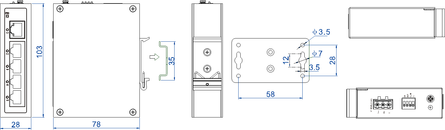 | Mechanical Structure | Housing: IP40 Protection Rating, Metal Housing Mounting: DIN Rail or Wall-Mounted Mounting Dimensions (W×H×D): 28mm×103mm×78mm |