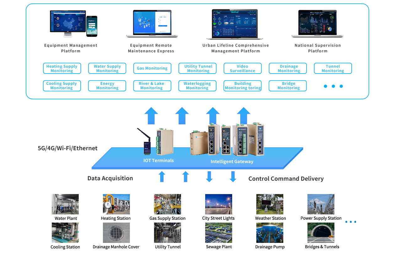 Install various sensors and monitoring equipment at key facilities within the city's lifeline systems (such as water treatment plants, power plants, gas stations, transportation hubs, etc.). Utilize WideIOT's industrial smart gateways to collect operational data from these facilities (including operational status, parameter metrics, etc.). Transmit the collected data to the integrated management platform for city lifeline systems, where it undergoes comprehensive analysis and processing. Real-time monitoring of facility operational status enables timely alerts for faults or anomalies, along with diagnostic analysis and resolution recommendations. During emergencies, the platform coordinates emergency response dispatch and resource allocation across departments, enhancing the overall management efficiency of the city's critical infrastructure systems.