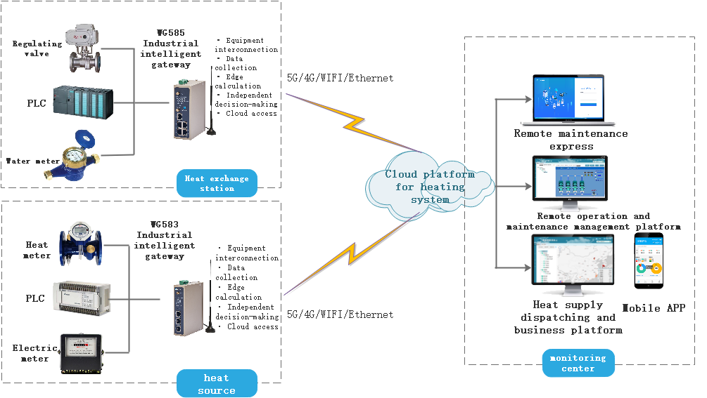 WideIOT is an industrial intelligent gateway, remote operation and maintenance management platform and intelligent dispatching cloud platform tailored for the heating industry. It can collect the data of heat sources, heat networks, heat exchange stations and industrial equipment distributed all over the country to the cloud platform for analysis and display. It cooperates with the big data cloud platform to build a comprehensive management, control and operation and maintenance system of "edge computing" + "cloud computing", so as to realize the balance adjustment and dispatching of the large network in the heating industry; At the same time, through the industrial intelligent gateway, remote operation and maintenance management platform and remote maintenance management system of WideIOT, remote operation and maintenance management can be realized for field equipment distributed around the country, greatly improving the operation and maintenance efficiency and system stability, thus achieving the business goals of cost reduction, energy conservation and optimization.