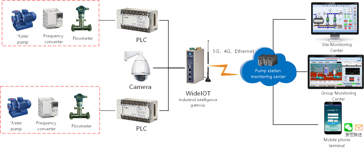 The WideIOT industrial intelligent gateway is connected to the pump room PLC controller, collects the operating status of the pump station in multiple directions, accesses the Internet through 5G/4G/WIFI, etc., and transmits the data to the pump station monitoring center (WideIOT equipment data cloud platform or self-developed cloud platform); managers can remotely monitor the status of the pump station at any time in the pump station monitoring center or mobile terminal, and colleagues can remotely configure, diagnose and modify the pump station PLC program through the equipment express line, so that the pump station is unmanned. on duty.